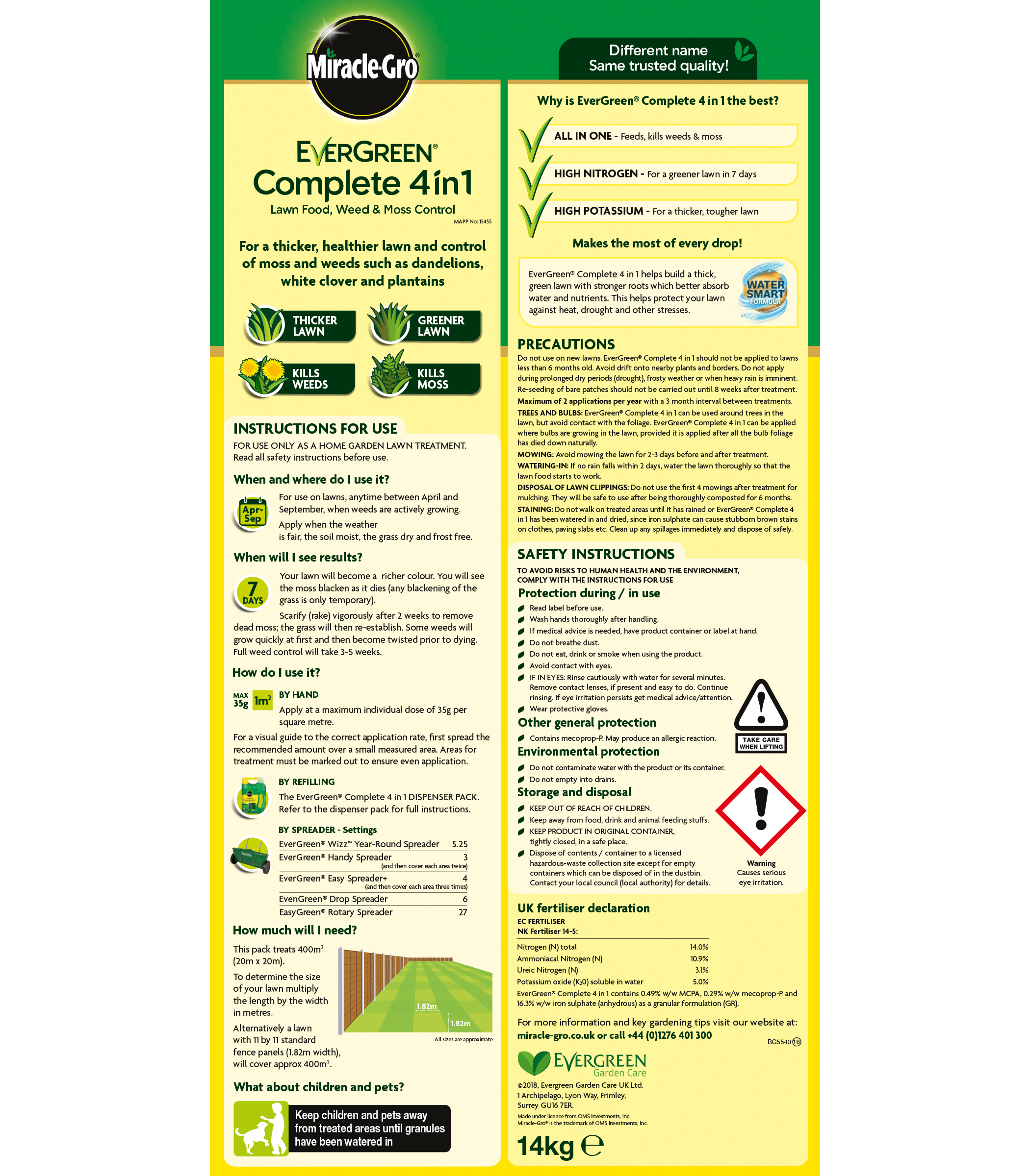 • NPK 14-0-5 contains MCPA, mecoprop-P and ferrous sulphate, Coverage 360m² +