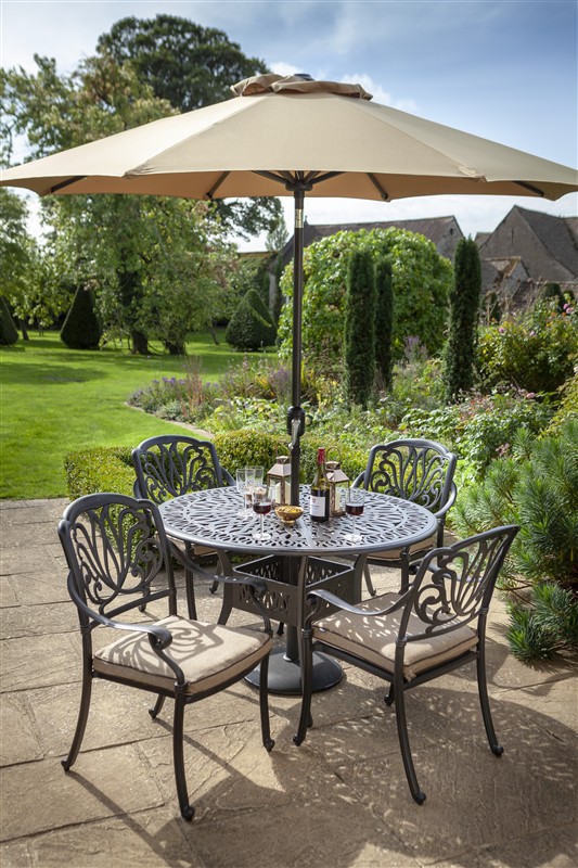 This set includes: 1 x Amalfi Round Dining Table 4 x Amalfi Dining Chairs with Amber Seat Cushions 1 x 2.5m Round Crank Handle Parasol & 15kg Concrete Base *not suitable on some composite decking – check with your manufacturer.