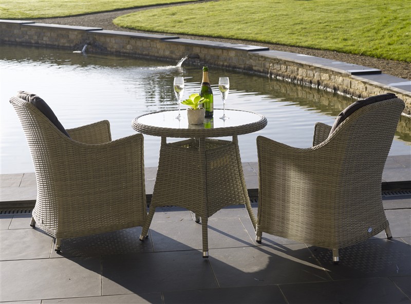 This small but perfectly formed bistro set provides the perfect setting for morning coffee, afternoon tea or a sundowner for two. Relax in the comfort of the Dove Grey rattan armchairs – their curved lines and flared armrests add a modern twist to a traditional design. Soft-touch Eco cushions in Charcoal are made using recycled plastic bottle technology. The sociable round table features a glass top which is recessed into the weave for added protection and aesthetics.