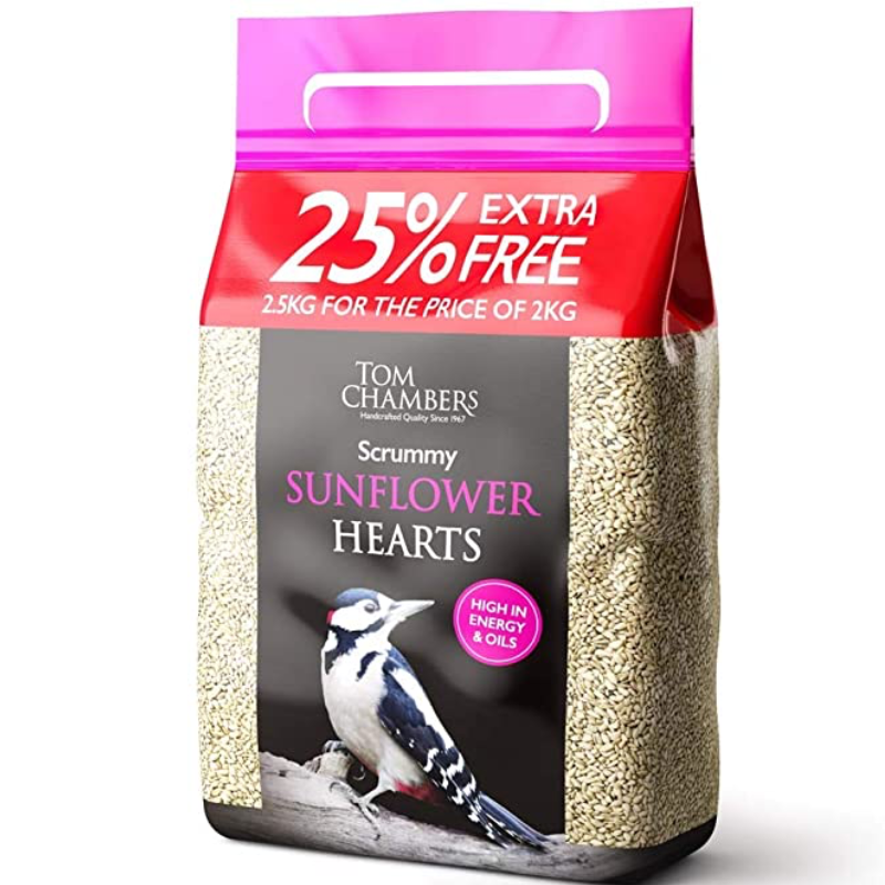 Tom Chambers have years of experience of creating and blending quality food for garden birds. Scrummy Sunflower Hearts is a husk free, no mess mix packed with calories and essential oils. For use in seed feeders, ground feeders or on bird tables.