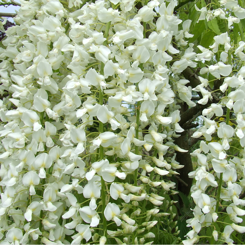 Long clusters of white flowers tinged with lilac. Foliage dies back in autumn to return the following year.Highly scented. Traditionally grown up a wall, pergola or fence. Can be trained as a standard. Produces a stunning display once mature, which can take a few years. Attractive to bees.